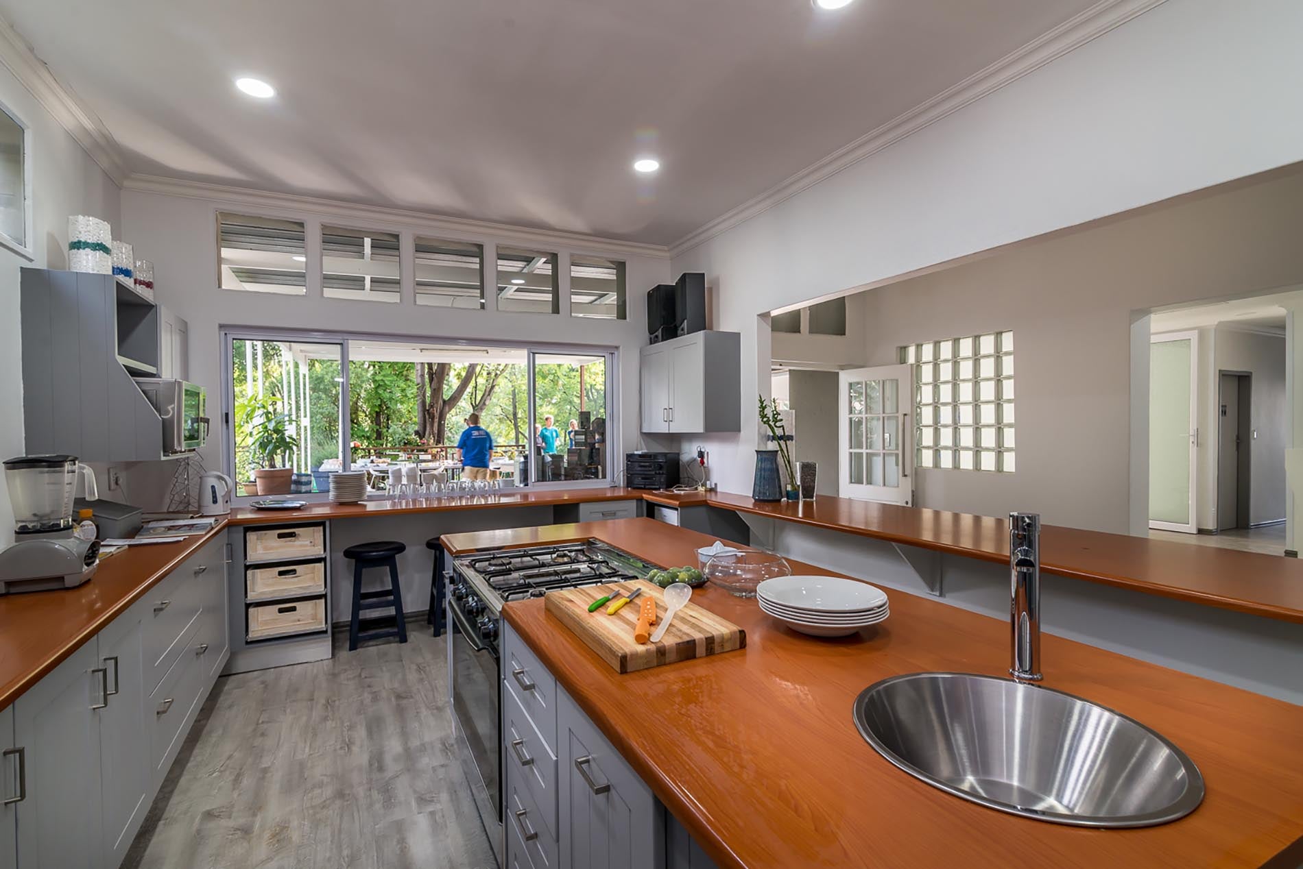 The open-plan kitchen seamlessly extends to an outdoor bar counter, featuring wide sliding windows for convenient pass-through service from the kitchen to the patio.